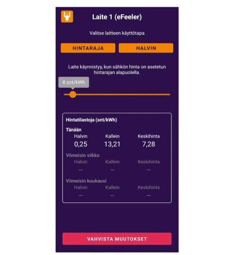 eFeeler seuraa reaaliaikaisesti pörssisähkön hintoja ja tarjoaa käyttäjälle yksinkertaisen tavan optimoida liitettyjen sähkölaitteiden käyttö edullisimpiin aikoihin. Näin voit hyödyntää sähkön hintavaihteluita ja säästää merkittävästi energiakustannuksissa.